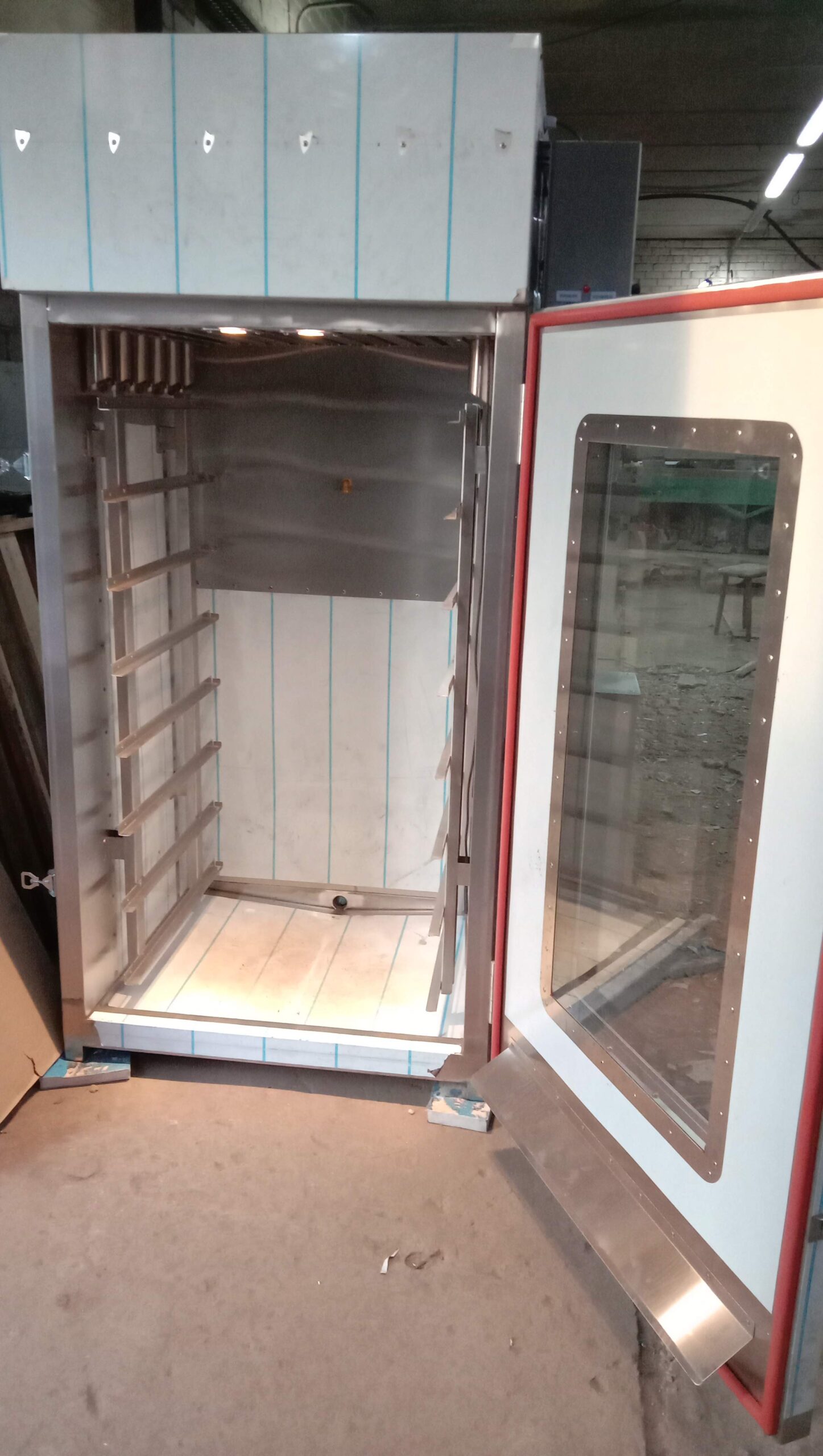Всередині камери змонтовані знімні напрямні для розміщення продукції, промисловий циркуляційний відцентровий вентилятор, нагрівачі.