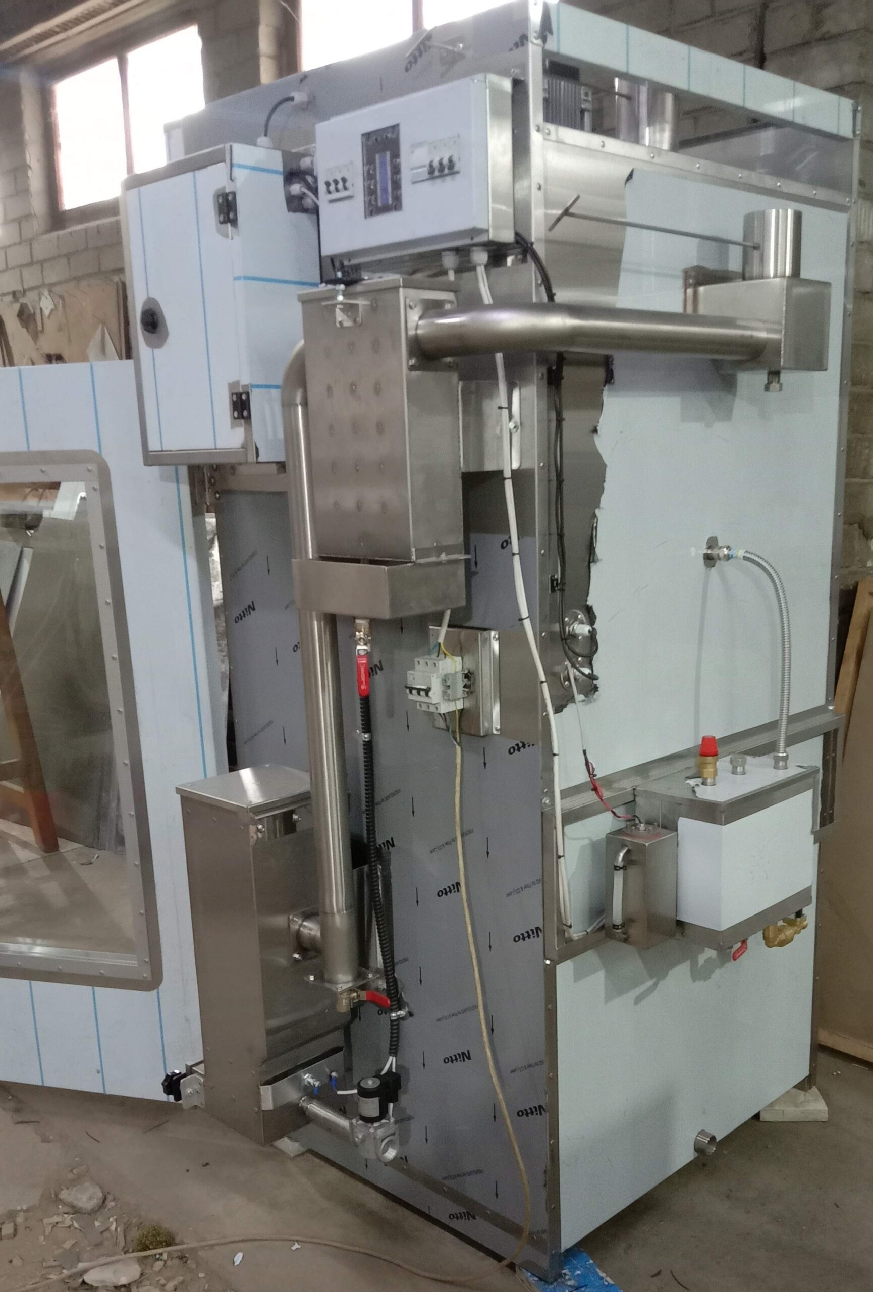 2) Парогенератор бойлерного типу. Пар отримується за рахунок нагріву води ТЕН-ами, що дозволяє отримати насичений пар і зменшити загальний час приготування продукту. У спеціальній герметичній ємності вода нагрівається, що призводить до випаровування води й утворення пари. У порівнянні з форсунковим парогенератором дозволяє отримати більш насичений пар за короткий час. Вартість – 15000 грн. Потужність парогенератора 3600 Вт. Комплектується автоматикою для контроля рівня води і автоматичного наповнення з водопроводу. Парогенератор утеплений. Виготовляється із нержавіючої сталі AISI 304 товщиною 1.5 мм.